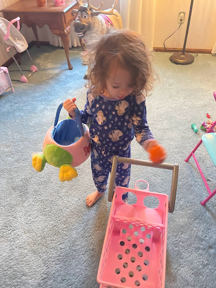 This year's baskets were simple, no rhyme or reason. Anna got a sunflower, some candy, bubbles, a book, and a Fisher Price water magic book. I don't recommend the water magic book. the pen you had to squeeze to use and was to hard for her to do, was a pain to fill the water pen, and the book is destroyed (ripping and pages rolling up) after just one use. We like Mellissa and Doug Water Wow's a lot better.